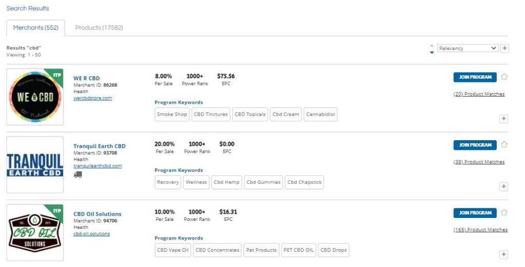 As you can see there are 552 merchants in the CBD niche and over 17,000 affiliate products.