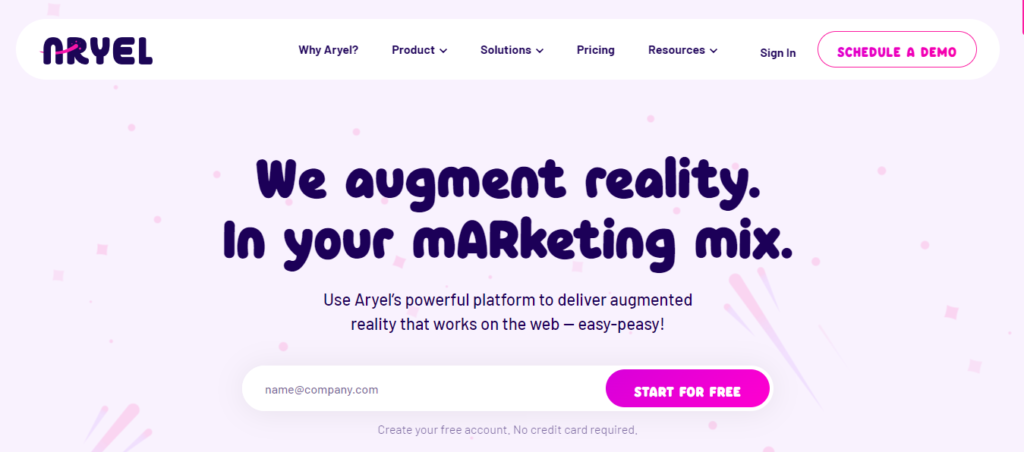 Aryel is a marketing platform that enables brands and creative agencies to easily launch engaging WebAR marketing campaigns using drag and drop builder, publish them via a simple custom URL, track goals and conversions, and connect the campaign to the most commonly used marketing tools.