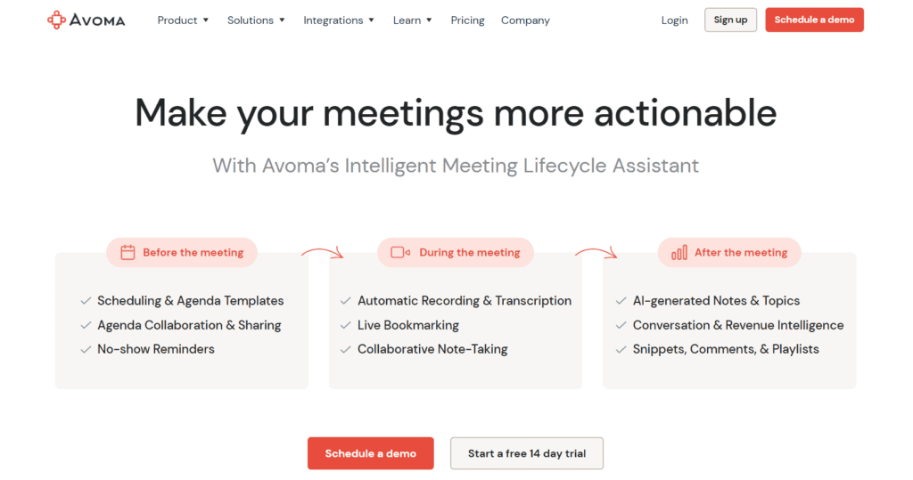 Avoma analyzes each meeting from the moment it starts to provide insights into what’s happening in real-time. It then automatically generates transcript of the meeting and provides action items for attendees, including phone numbers, email addresses, and contact information for those people who were not at the meeting.