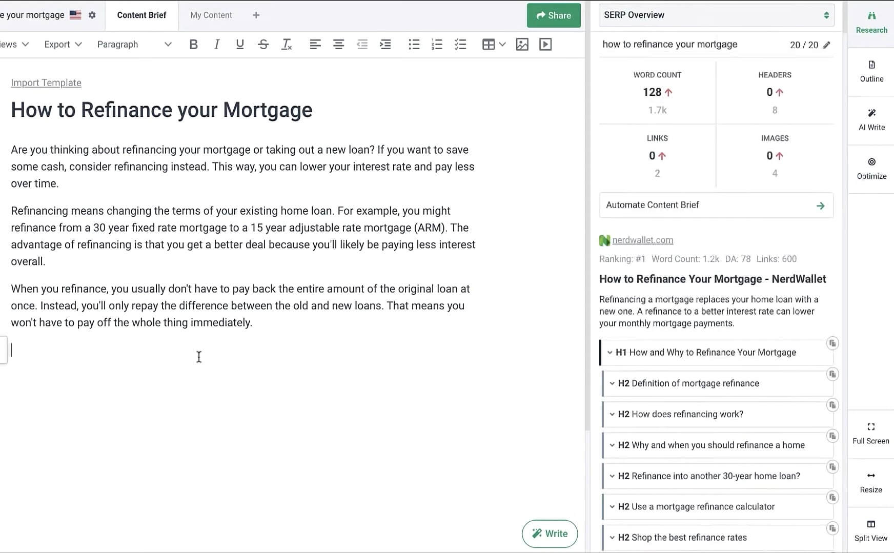 One of the best features of Outranking is its automated SEO first draft: it uses a combination of AI and human intelligence to generate an optimal first draft that you can then edit and finalize as needed.