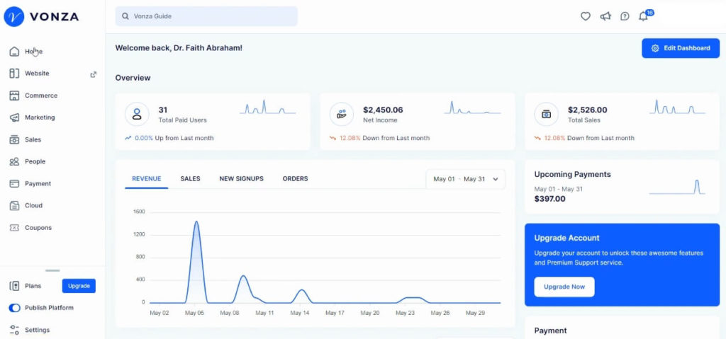 Let’s start off with the dashboard. It gives you a snapshot to easily provide an eye-pleasing view of all the sales, total paid users, net income, lifetime sales, and even new signups as well as orders.