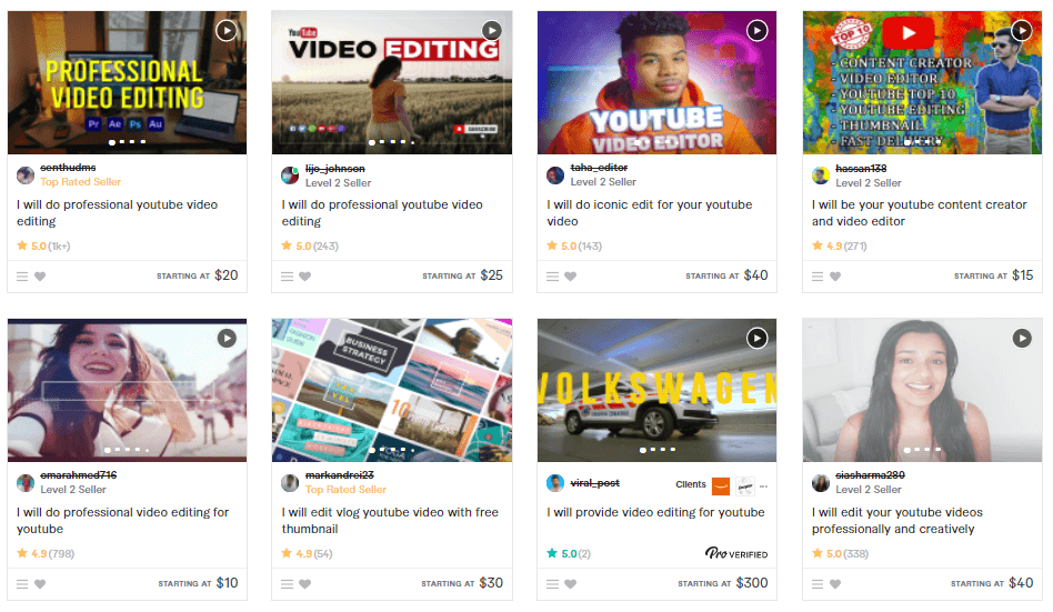 The pricing for video editing on Fiverr ranges from $10 up to a few hundred dollars.