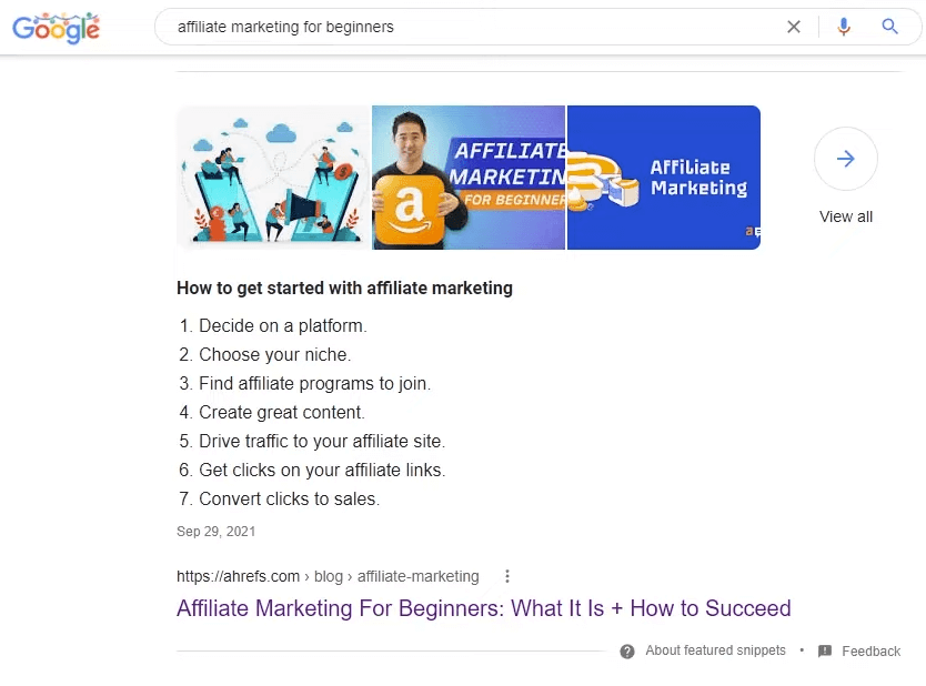 So I searched for “affiliate marketing for beginners” and as you can see, on the Google SERP results we’ve got Ahrefs ranking number one.