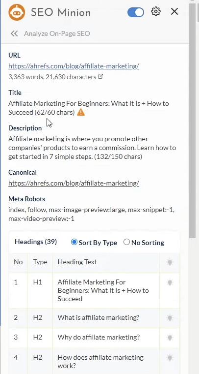 So here we have the “affiliate marketing for beginners” that I want to target and I’m going to turn on SEO Minion, then click “Analyze on-page SEO” and this is going to give me a bunch of data about the page, including all of their sub-headings, all of their, their headings and subheadings.