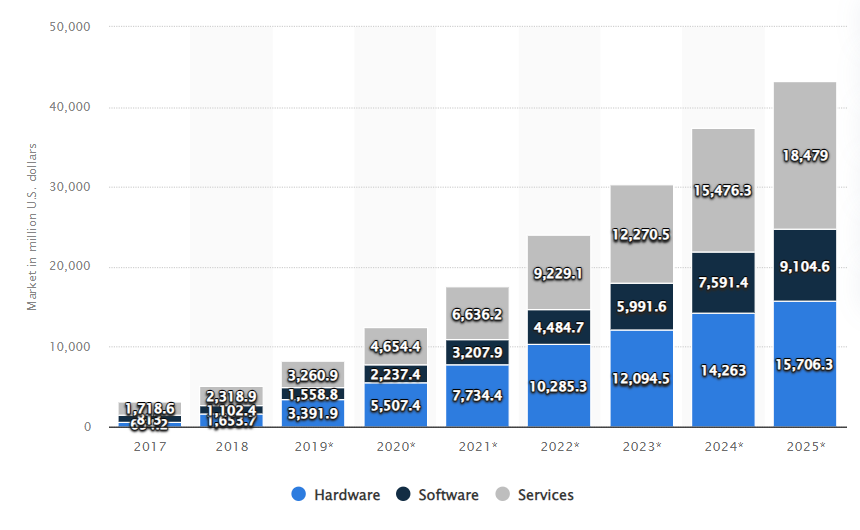 The NLP market is anticipated to grow from around three billion dollars in 2017 to about 43 billion in 2025, a nearly 14-times increase over its 2017 size (Statista)